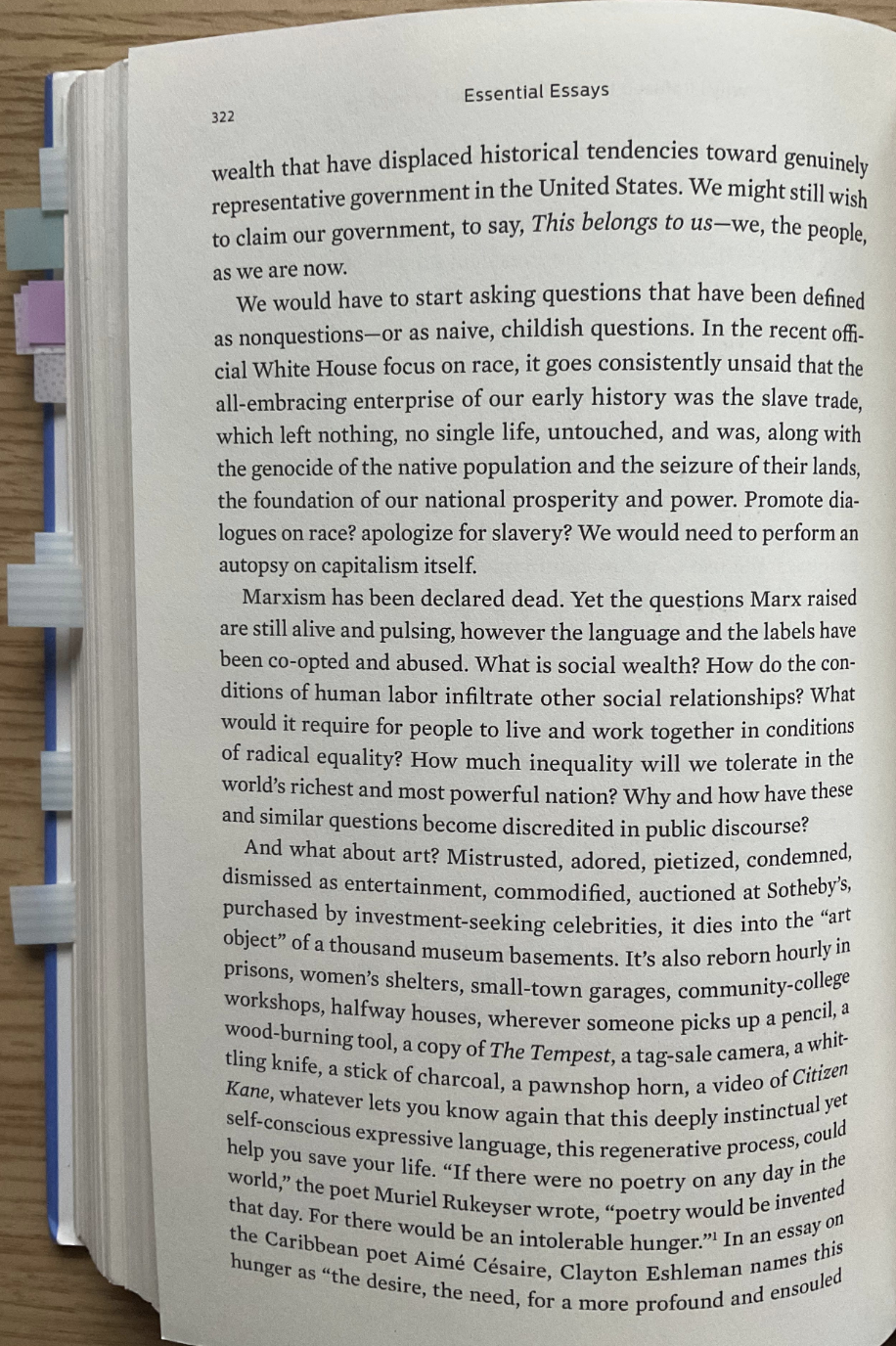 From a Substack note, written while reading Essential Essays: Taking my sweet time reading the Essential Essays of Adrienne Rich, mostly because her writing is so delicious and incisiveness. I have many marked and tagged pages, but this passage from the article she wrote regarding her refusal of the National Medal for the Arts is why Rich was a real one. She of all people truly understood that art, that includes writing, is not merely for the sake of decor and artfulness, but collective effort, “reborn hourly”. We need more wisdom like hers.