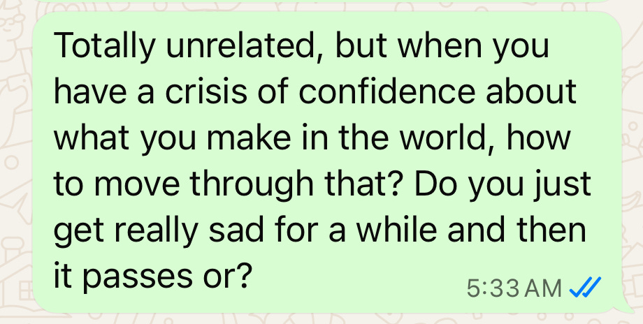 But back to Berlin. It was my second day in the city when a crisis of creative confidence arose. I reached out to my friend, whom I know would have some Thoughts about what was bubbling. There was something about the city, or a culmination of all of the above, that spiraled into existential questions about the point of human creation, and more specifically, my contribution to it.