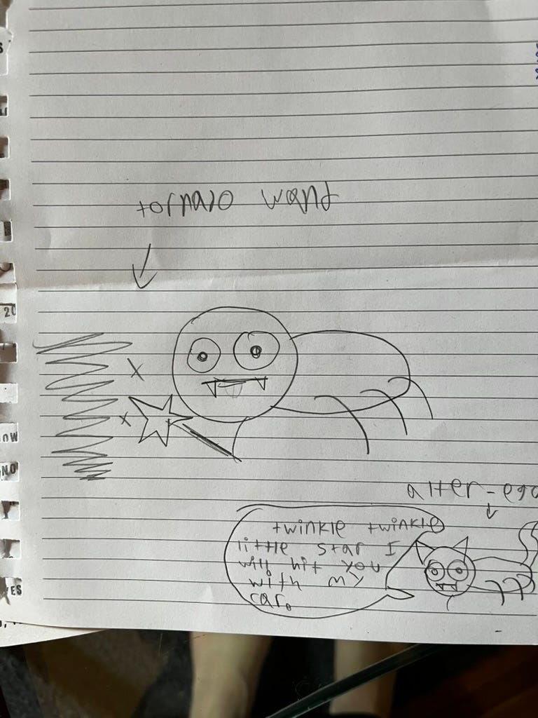 That included my table mate, a 12 year old genius of many skills, talents and senses of humor – from the very low to the very sophisticated. Early on we both decided to be friends and to commemorate the occasion she drew me as a spider with a princess wand that creates tornadoes. As a Kansan and appreciator of spiders, this was just the sort of magic I was looking for at yesterday’s event.